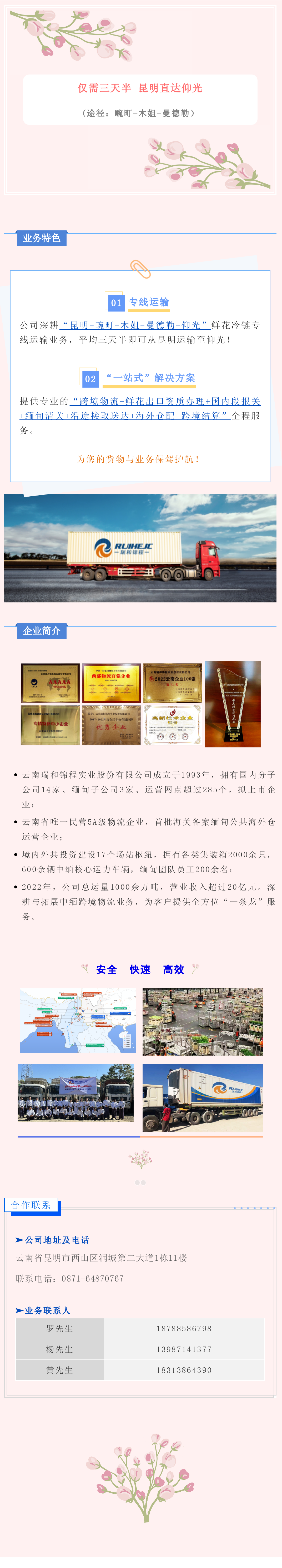 新聞動(dòng)態(tài) 業(yè)務(wù)推介 黨建工會(huì) 電子刊物 公示公告 首頁(yè) > 企業(yè)資訊 > 業(yè)務(wù)推介 業(yè)務(wù)推介 | 鮮花冷鏈專線運(yùn)輸 來(lái)源:瑞和錦程 瀏覽量:8195 日期:2023-05-11 上一篇:中緬跨境物流丨海陸空三通道正常發(fā)運(yùn) 下一篇:瑞和錦程:“高效”“雙碳”雙管齊下,為水泥運(yùn)輸發(fā)展助力